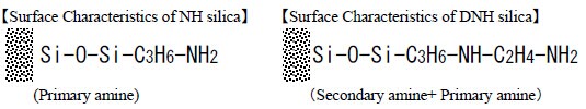 ? ?DNH硅膠鍵合的二元胺和一元胺是NH硅膠的2倍。基于這個原因,DNH硅膠的堿度要比NH硅膠強,并且由于碳鏈較長,DNH硅膠的氫鍵作用要比NH硅膠弱一些。因此,DNH硅膠的流動相要選擇極性小的溶劑,因為DNH硅膠的洗脫速度要比普通的裸硅膠和NH硅膠快。