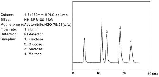 糖類物質的分析和制備,在液相色譜領域占有重要的地位。迄今為止,大多數的分離介質僅僅局限在分析級別。但是富士硅膠研發出用于制備色譜的新的氨基硅膠。當使用高水相為流動相時,一般的氨基填料會暴露出很多問題。氨基硅膠的pH值很高,一般pH為9.0,在這樣高的pH條件下,目標化合物一般都會變性,并且會毀壞硅膠基質的表面。考慮到這些問題,富士公司研發出新的氨基硅膠填料,稱之為NH SG硅膠。NH SG硅膠可以最小化甚至是避免上述問題,并且對糖類化合物進行更好的分離。
