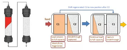 ? ? ? ?Capture SMB是將第一根層析柱的上樣流穿繼續上樣至第二根層析柱,待第一根層析柱完全滿載后,方結束其上樣,進行淋洗、洗脫等操作,而此時第二根層析柱仍在繼續上樣。通過切換柱位操作,保證2根層析柱的洗脫、再生、上樣等操作交替銜接進行,保證連續上樣,從而實現工藝與系統硬件設計的高度契合,使填料利用率最大化,用量大為縮減。