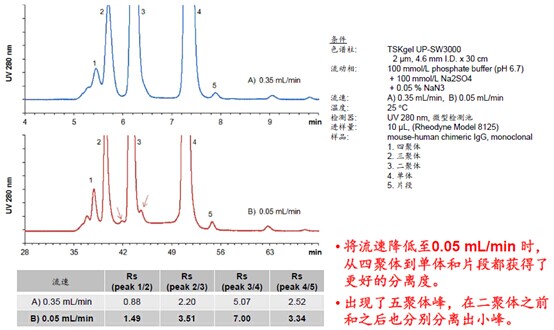 ?????? 抗體藥物中使用的單克隆抗體,在生產、貯藏或運輸過程中可能會形成二聚體等凝聚物,存在引發不良反應的風險因素,故在質量控制中采用體積排阻色譜法(SEC)對單克隆抗體進行分離分析。現有的TSKgel?G3000SWXL色譜柱常用于此用途,但仍需要更高分離度以及更短分析時間的SEC分析技術。現在2μm粒徑的高性能SEC?色譜柱TSKgel?UP-SW3000已實現了商品化,給您帶來更高效更快捷的分離體驗!