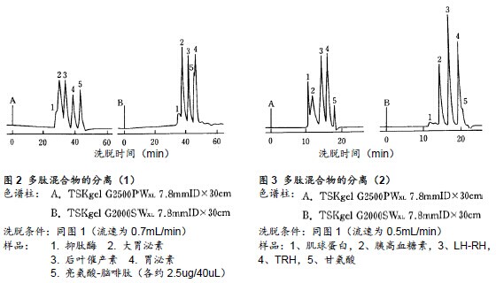 ??? 表3所示為采用尺寸排阻色譜法進行多肽分離時,TSKgel色譜柱產品的不同性能。一般考慮采用TSKgel G2000SWXL較為適合,但考慮到填充劑的耐堿性與多肽的分子量大小等因素,也可根據情況而選擇使用TSKgel G2500PWXL或TSKgel G3000PWXL。