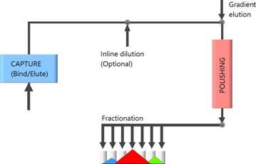 Contichrom系統(tǒng)可以將兩個(gè)層析步驟(例如捕獲和精純)整合為一個(gè)單一的過程,第一步層析洗脫的產(chǎn)物可以直接被稀釋,從而直接進(jìn)行第二步層析,因此省略了中間的間歇過程,這是非常適用于高生產(chǎn)量純化的。