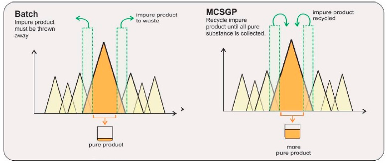 MCSGPMulticolumn Countercurrent Solvent Gradient Purification)用于精純環(huán)節(jié),無需通過耗時(shí)的實(shí)驗(yàn)設(shè)計(jì)(DoE)確定工藝條件,可有效克服典型SMB(模擬移動床)僅適用于二元分離、無法實(shí)現(xiàn)線性梯度的缺點(diǎn)。