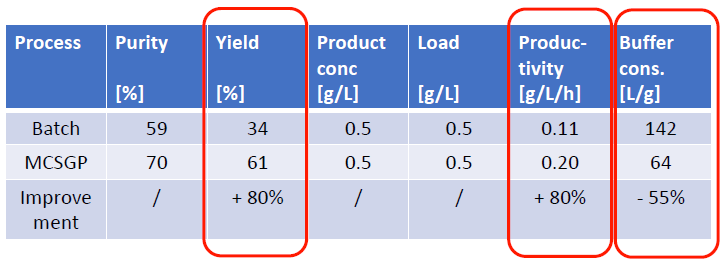 MCSGP可將產(chǎn)品純度從傳統(tǒng)工藝的59%提升至70%,將收率從傳統(tǒng)工藝的34%提升至61%,從而使產(chǎn)量(g /L /h)整體提升80%,并同時(shí)使Buffer的消耗量降低55%MCSGP工藝,無疑可顯著地節(jié)約成本投入,并可產(chǎn)生更多的生產(chǎn)效益。