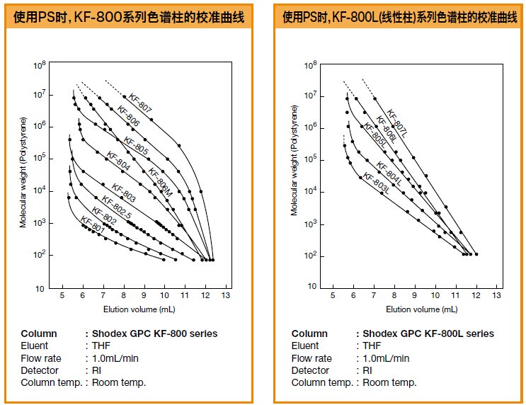 GPC KF-804是標準的油溶性SEC色譜柱,適用于從低分子量到高分子量的寬范圍的樣品。流動相是THF。