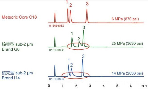 Meteoric Core C18與常規(guī)使用的全多孔型C18相比,在相同條件下可使分析時間縮短至2/3。因其具有卓越的分離能力,即使將流速提高1倍,仍可維持高效的理論塔板數(shù)狀態(tài)并使分析時間縮短至1/3,而此時色譜柱背壓不足5000psi,與普通Sub-2um色譜柱相比,色譜柱背壓更低的Meteoric Core C18為HPLC和UHPLC的使用分析中提供了高性能高生產(chǎn)性的新選擇。