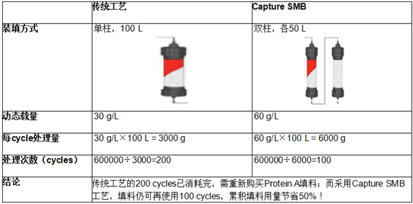 ? ? ?Capture SMB是將第一根層析柱的抗體/蛋白流穿繼續(xù)上樣至第二根層析柱,待第一根層析柱完全滿載后,方結(jié)束其上樣進(jìn)行淋洗,并繼續(xù)進(jìn)行洗脫、再生、再平衡操作,而此時(shí)第二根層析柱會(huì)獨(dú)立進(jìn)行上樣操作。通過切換柱位操作,保證2根層析柱的洗脫、再生、上樣等操作交替銜接進(jìn)行,從而實(shí)現(xiàn)工藝與系統(tǒng)硬件設(shè)計(jì)的完美結(jié)合,使填料利用率最大化,累積用量大為縮減。