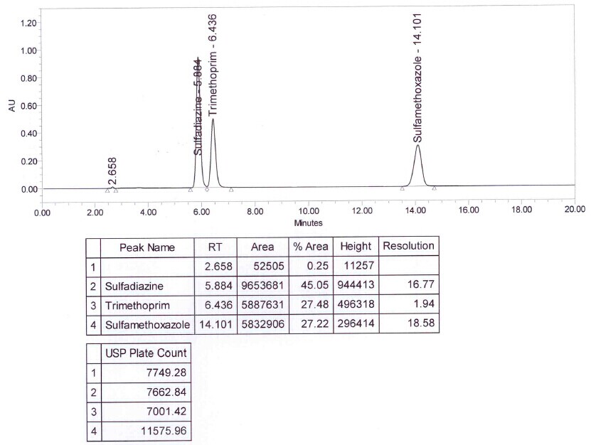 ??? 下圖是用Merck Hibar Purospher STAR LP 柱,使用藥典的方法,對(duì)聯(lián)磺甲氧芐啶片中磺胺甲噁唑、磺胺嘧啶和甲氧芐啶含量進(jìn)行測(cè)試的譜圖,請(qǐng)參考。