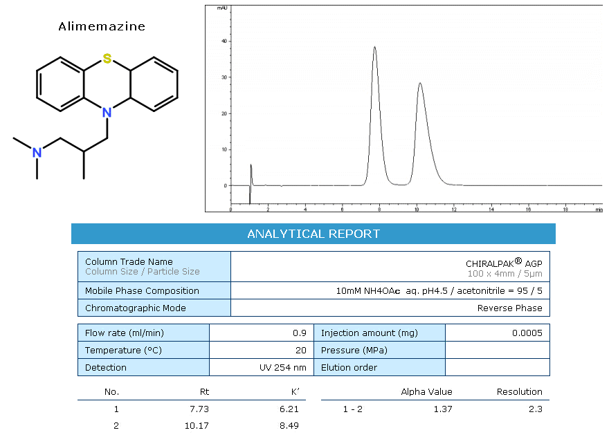 AGP為蛋白質(zhì)鍵合型手性柱,硅膠表面共價(jià)鍵合有α1-酸性糖蛋白。適用于反相系統(tǒng)。 在所有蛋白質(zhì)鍵合手性柱中,具有最廣泛的適用范圍: 1. 胺類化合物(一級(jí)胺,二級(jí)胺,三級(jí)胺,四級(jí)胺類化合物) 2. 酸性化合物(強(qiáng)酸性化合物,弱酸性化合物) 3. 非質(zhì)子類化合物(酰胺類化合物,酯類化合物,醇類化合物,亞砜類化合物等)