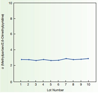 上圖所示,顯示了對(duì)羥基苯甲酸甲酯/2,6-二甲基吡啶(Methylparaben/2,6-Dimethylpyridine)在YMC-Pack ODS-AM液相色譜柱上10次的分離因子(α)。YMC公司在生產(chǎn)過程中采用的嚴(yán)格質(zhì)量控制體系,以保證產(chǎn)品生產(chǎn)批間的差異最小,提供高再現(xiàn)性的堿性化合物分析柱。